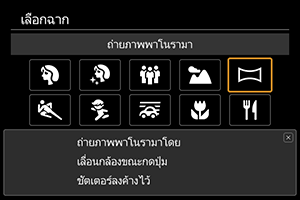 ใช้ [] (ถ่ายภาพพาโนรามา) เพื่อถ่ายภาพพาโนรามา กล้องจะสร้างภาพพาโนรามาจากการรวมภาพที่ถ่ายโดยการถ่ายภาพต่อเนื่องเข้าด้วยกัน เมื่อคุณเลื่อนกล้องไปยังทิศทางหนึ่งในขณะที่กดปุ่มชัตเตอร์ลงจนสุด