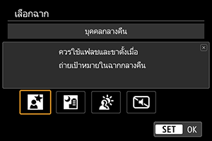 ใช้ [] (บุคคลกลางคืน) สำหรับการถ่ายภาพที่สว่างและสวยงามของบุคคลโดยมีฉากกลางคืนเป็นพื้นหลัง โปรดทราบว่าการถ่ายภาพในโหมดนี้ต้องใช้ชุดแฟลชภายนอก แนะนำให้ใช้ขาตั้งกล้อง
