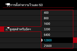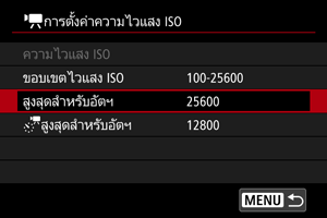 คุณสามารถตั้งค่าความไวแสง ISO สูงสุดในการบันทึกภาพเคลื่อนไหวในโหมด [], [