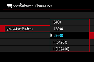 การตั้งค่าจากหน้าจอตัวเลือกความไวแสง ISO