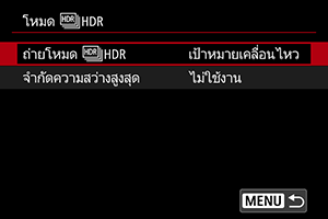 : จำลองการแสดงผล] เป็นตัวเลือกอื่นนอกเหนือจาก [ไม่ใช้งาน] ก็ตาม เมื่อตั้งค่า HDR ไว้เป็น [เป้าหมายเคลื่อนไหว] หรือ [ช่วงการรับแสง]