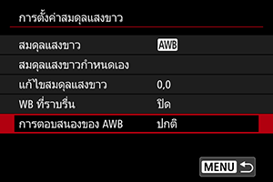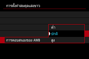 คุณสามารถตั้งค่าการตอบสนองสมดุลแสงขาวอัตโนมัติได้ เลือกจากการตอบสนองสามระดับเพื่อให้เหมาะกับสภาวะการถ่ายภาพ