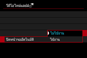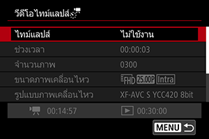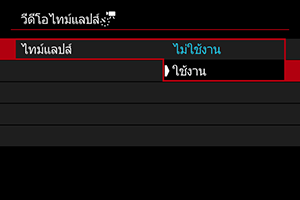 - ในการยกเลิกการบันทึกภาพเคลื่อนไหวแบบย่นเวลา ให้ตั้งค่า [ไทม์แลปส์] เป็น [ไม่ใช้งาน]