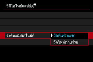 - เมื่อตั้งค่า [ระดับแสงอัตโนมัติ] เป็น [วัดใหม่ทุกเฟรม] ความไวแสง ISO ความเร็วชัตเตอร์ และค่ารูรับแสงอาจไม่ถูกบันทึกในข้อมูล Exif ของภาพเคลื่อนไหวแบบย่นเวลาในบางโหมดถ่ายภาพ