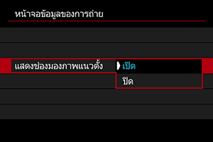 คุณสามารถเลือกวิธีการแสดงผลข้อมูลในช่องมองภาพได้ เมื่อคุณถ่ายภาพนิ่งในแนวตั้ง