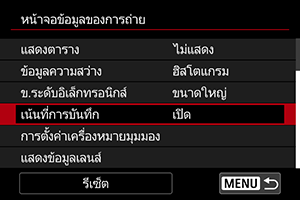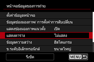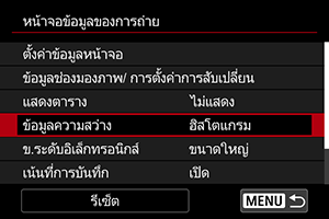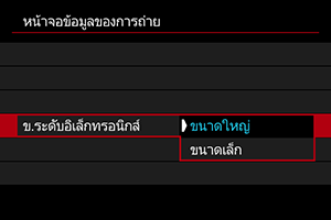 เลือกประเภทฮิสโตแกรม ([ความสว่าง] หรือ [RGB]) และขนาดที่แสดง ([ขนาดใหญ่] หรือ [ขนาดเล็ก])