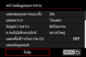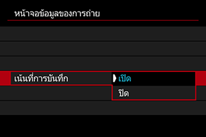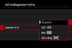 คุณสามารถกำหนดรายละเอียดและหน้าจอของข้อมูลที่จะแสดงบนหน้าจอหรือในช่องมองภาพได้เองเมื่อคุณถ่ายภาพ