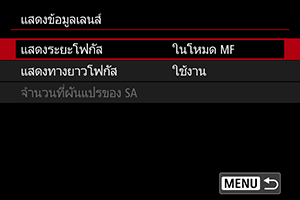 คุณสามารถแสดงระยะโฟกัส เมื่อใช้เลนส์ RF หรือ RF-S ในการแสดงระยะโฟกัส คุณสามารถเลือกเวลาและหน่วยของการวัด