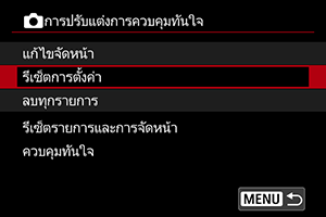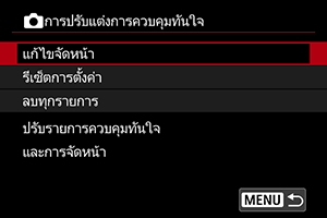 - เลือก [รีเซ็ตการตั้งค่า] เพื่อคืนค่าเริ่มต้นสำหรับรายการและการจัดหน้าในหน้าจอควบคุมทันใจ
