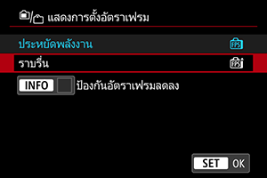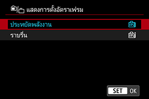 คุณสามารถตั้งค่าอัตราเฟรมในการแสดงผลสำหรับหน้าจอการถ่ายภาพในการถ่ายภาพนิ่ง เลือกว่าจะประหยัดพลังงานแบตเตอรี่หรือใช้อัตราเฟรมสูงสำหรับการแสดงผล
