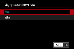 ตั้งค่าเป็น [เปิด] สำหรับสัญญาณออกภาพเคลื่อนไหว RAW จากช่องสัญญาณ HDMI ไปยังอุปกรณ์ที่รองรับ