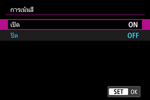 - ในระหว่างการส่งสัญญาณออกทาง HDMI การแสดงผลการเน้นสีจะไม่แสดงบนอุปกรณ์ที่เชื่อมต่อผ่าน HDMI โปรดทราบว่าการแสดงผลการเน้นสีจะแสดงบนหน้าจอกล้องเมื่อตั้งค่า [