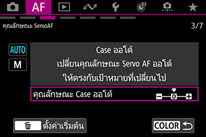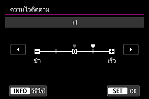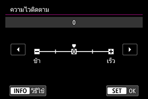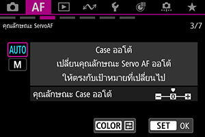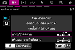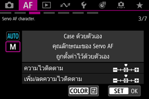 คุณสามารถตั้งค่าพารามิเตอร์การติดตาม Servo AF (ความไวติดตามวัตถุและการติดตามแบบเพิ่ม/ลดความไว) สำหรับวัตถุและสถานการณ์การถ่ายภาพ