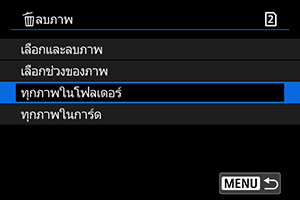 คุณสามารถลบภาพทุกภาพในโฟลเดอร์หรือในการ์ดได้พร้อมกันในครั้งเดียว