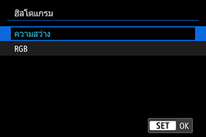ฮิสโตแกรมแสดงระดับสัญญาณผ่านช่วงโทนสี การแสดงผลความสว่าง (สำหรับตรวจสอบระดับค่าแสงทั่วไปและการไล่ระดับสีโดยรวม) และการแสดงผล RGB (สำหรับตรวจสอบความอิ่มตัวของสีและการไล่ระดับสีแดง เขียว และน้ำเงิน) พร้อมใช้งาน คุณสามารถเปลี่ยนฮิสโตแกรมที่แสดงได้โดยการกดปุ่ม เมื่อ [