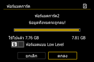 - ระหว่างการฟอร์แมตแบบ Low Level คุณสามารถยกเลิกการฟอร์แมตได้โดยการเลือก [ยกเลิก] ถึงแม้จะสั่งยกเลิก การฟอร์แมตแบบธรรมดาจะดำเนินต่อไปจนเสร็จสิ้น จากนั้นคุณสามารถใช้การ์ดได้ตามปกติ