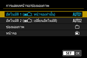 - คุณยังสามารถสลับการแสดงผลระหว่างช่องมองภาพและหน้าจอได้โดยกดปุ่มที่คุณได้กำหนดให้สลับเอง เมื่อมีการตั้งค่านี้เป็น [AUTO1] หรือ [AUTO2] กล้องจะตอบสนองต่อเซนเซอร์ช่องมองภาพตามนั้น