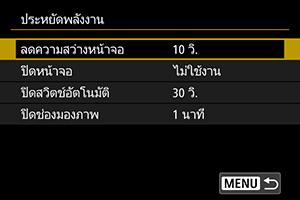 คุณสามารถปรับการกำหนดเวลาที่จะลดความสว่างแล้วปิดหน้าจอ เวลาที่จะปิดกล้อง และเวลาที่จะปิดช่องมองภาพหลังจากไม่ได้ใช้งานกล้อง (ลดความสว่างหน้าจอ ปิดหน้าจอ ปิดสวิตช์อัตโนมัติ และปิดช่องมองภาพ)