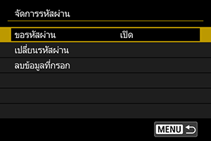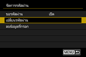 คุณสามารถเปลี่ยนรหัสผ่านที่จะป้อนเมื่อตั้งค่าสวิตช์เปิด/ปิดกล้องเป็น หรือกล้องกลับมาทำงานหลังจากการปิดอัตโนมัติ