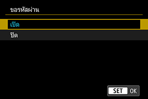 คุณสามารถเลือกได้ว่าต้องป้อนรหัสผ่านหลังจากตั้งค่าสวิตช์เปิด/ปิดกล้องเป็น หรือให้กล้องกลับมาทำงานหลังจากการปิดอัตโนมัติก็ได้