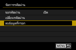คุณสามารถรีเซ็ตรหัสผ่านและการตั้งค่าสำหรับการถ่ายภาพและฟังก์ชั่นของเมนูให้เป็นค่าเริ่มต้นได้