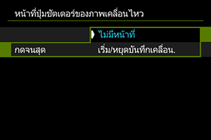 - ในการบันทึกภาพเคลื่อนไหว การตั้งค่า [หน้าที่ปุ่มชัตเตอร์ของภาพเคลื่อนไหว] จะมีผลเหนือฟังก์ชั่นใดๆ ที่กำหนดให้กับปุ่มชัตเตอร์ใน [