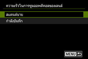 ตั้งค่าระดับความเร็วในการซูม (สัมพันธ์กับความเร็วในการซูม) หากต้องการซูมให้เร็วขึ้นหรือช้าลงโดยขึ้นอยู่กับวิธีการหมุนวงแหวนซูม