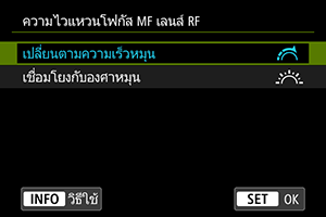 - เมนูนี้จะไม่แสดงเลนส์ที่มีสวิตช์แหวนปรับโฟกัส/แหวนควบคุม ใช้เลนส์เพื่อกำหนดค่าฟังก์ชั่นการทำงานของแหวนปรับโฟกัส/แหวนควบคุม