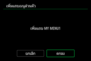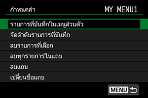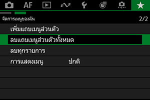 คุณสามารถลบแถบเมนูส่วนตัวทั้งหมดที่คุณสร้างไว้ เมื่อคุณเลือก [ลบแถบเมนูส่วนตัวทั้งหมด] ทุกแถบตั้งแต่ [MY MENU1] ถึง [MY MENU5] จะถูกลบ และแถบ [] จะเปลี่ยนกลับเป็นค่าเริ่มต้น