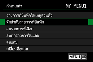 คุณสามารถปรับเปลี่ยนลำดับของรายการที่บันทึกไว้ในเมนูส่วนตัว เลือก [จัดลำดับรายการที่บันทึก] เลือกรายการที่จะจัดเรียงใหม่ จากนั้นกดปุ่ม
