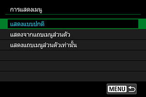 คุณสามารถเลือก [การแสดงเมนู] เพื่อตั้งค่าหน้าจอเมนูที่จะปรากฏขึ้นก่อน เมื่อคุณกดปุ่ม