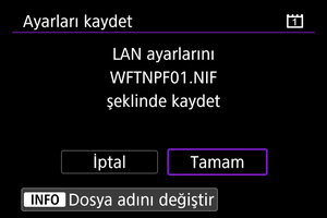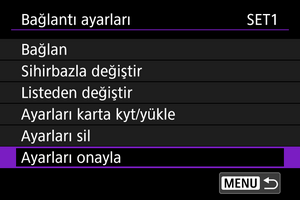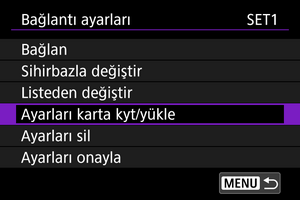 Bağlantı ayarları bir karta kaydedilebilir ve diğer fotoğraf makinelerine uygulanabilir. Diğer makinelerde yapılandırılan makine ayarları kullanılacak makineye de uygulanabilir.