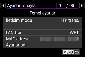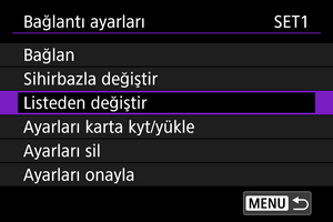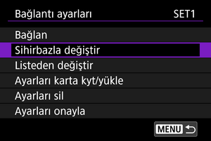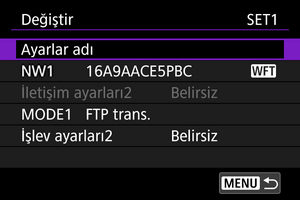 Fotoğraf makinesine kayıtlı olan iletişim ve işlev ayarlarını kullanarak makinede kayıtlı bağlantı ayarını değiştirin. Ayar isimlerini de kaydedebilirsiniz.