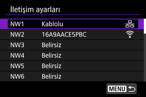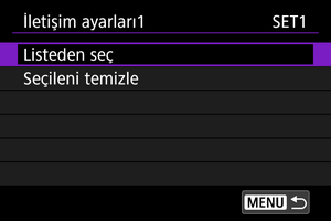 - [Listeden seç] seçildiğinde, makinede kayıtlı olan iletişim ayarları listelenir. Kullanılacak iletişim ayarlarını seçin.