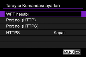 [Tarayıcı Kumandası ayarları] seçildiğinde Browser Remote erişimi için kullanılmak üzere hesap açabilir ve HTTP/HTTPS iletişim ayarlarını yapılandırabilirsiniz.
