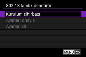 [802.1X kimlik denetimi] seçildiğinde bir ayar sihirbazı kullanarak 802.1X kimlik denetimi ayarlarını yapabilir, kontrol edebilir veya silebilirsiniz.