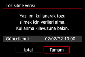 Fotoğraf makinesi bundan sonra tüm çekimlere elde edilen Toz Silme Verisini ekler. Çekimden önce Toz Silme Verisini hemen almanız önerilir.