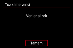- Resim çekildiği zaman fotoğraf makinesi Toz Silme Verisini toplamaya başlar. Toz Silme Verisi elde edildiğinde bir mesaj görüntülenir.