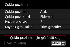 [Çoklu pozlama için görüntü seç] ile karta kayıtlı görüntülerden birini ilk tekil poz olarak seçebilirsiniz (). Kartta kayıtlı çoklu görüntü kayıtlarını birleştiremezsiniz.