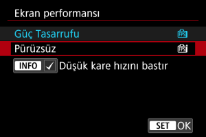 - Vizörlü çekimde, çekimde bekleme için [Pürüzsüz] seçeneğinin yüksek çekim hızı (119,88 kare/sn) görüntülemesi kullanılır.