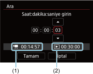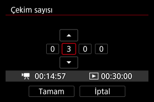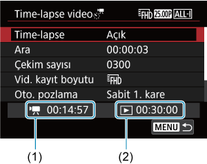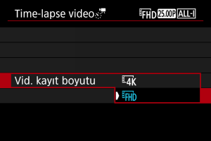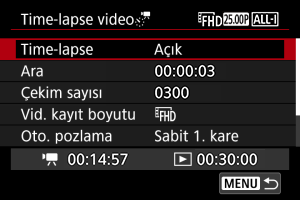Belirlenen intervallerde çekilen fotoğraflardan 4K video veya Full HD video ayarında zaman aşımlı video oluşturmak için video kayıt süresini (videoyu oynatmak için gerekli süreyi) belirtir.