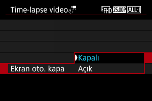 - Zaman aşımlı video kaydını iptal etmek için [Time-lapse] seçeneğini [Kapalı] olarak ayarlayın.