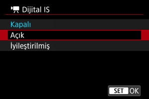 Dijital IS]’nin [Açık] veya [İyileştirilmiş] olarak ayarlanmasıyla [IS modu] da [Açık] olarak ayarlanır.