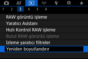 Piksel sayısını düşürmek ve yeni bir fotoğraf olarak kaydetmek için bir JPEG veya HEIF fotoğrafı yeniden boyutlandırabilirsiniz. RAW+JPEG ve RAW+HEIF çekimle yakalananlar dahil Büyük, Orta veya Küçük 1JPEG ya da HEIF görüntüler (Küçük 2 dışındaki boyutlarda) için yeniden boyutlandırma yapılabilir. Küçük 2 ve RAW fotoğraf ve videolar yeniden boyutlandırılamaz.