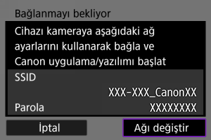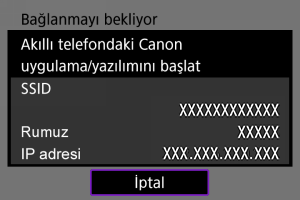 Akıllı telefona bağlan] seçimi yapmışsanız aşağıdaki mesaj görüntülenir. Camera Connect uygulaması zaten kurulmuşsa [Gösterme] seçimi yapın.