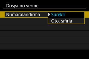 Lütfen unutmayın, dosya numaralandırma, geçiş yaptığınız kartlar veya klasörlerdeki mevcut olan görüntülerden itibaren devam edebilir. Ardışık dosya numaralandırması kullanmak istiyorsanız, her seferinde yeni formatlanmış bir kart kullanmanız önerilir.