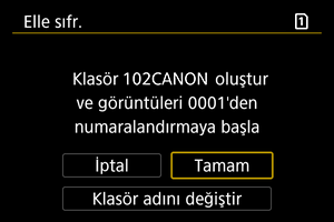 - Yeni klasör oluşturmak için [Tamam] seçimi yapın. Dosya numarası 0001 ile başlar.