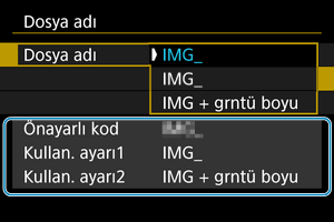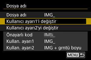Kullanıcı ayarı 1, istediğiniz dört karakteri kaydetmenizi sağlar. Kullanıcı ayarı 2, üç harfli kısaltma ve dördüncü bir karakter ekler. Bunları çekim sonrasında otomatik olarak eklenen görüntü boyutunu temsil eder.