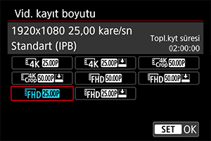 Kayıt boyutu, çekim hızı ve sıkıştırma yöntemini [: Vid. kayıt boyutu] içinde ayarlayabilirsiniz.