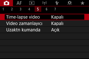 : Time-lapse video] seçeneğini [Kapalı] olarak, fotoğraf makinesini, arabirim kablosuyla bilgisayara bağladığınızda ve EOS Utility (EOS yazılımı) programını kullandığınızda ayarlayın. [Kapalı] dışındaki seçenekler belirlendiğinde, fotoğraf makinesi bilgisayar ile iletişime geçemez.